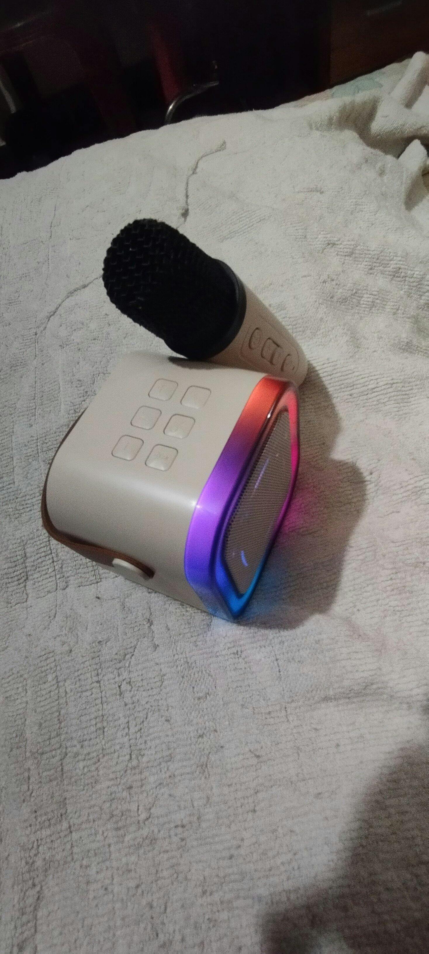 1. 4-in-1 Functionality: This -Compatible mini karaoke machine combines high-fidelity sound quality with a wireless mini microphone, providing professional audio effects. With easy one-button operation and a premium leather handle, it's convenient and portable.